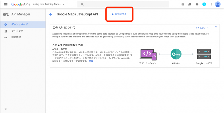 「ライブラリ」で各APIのページを選択し、「有効にする」リンクをクリックするとAPIが有効になります。(すでに有効な場合は「無効にする」と表示されます)