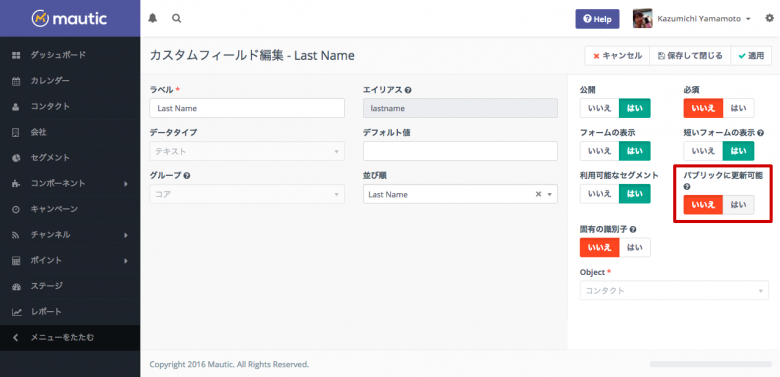画面の右上の歯車アイコンをクリックすると「カスタムフィールド」という項目があります。ここから上記のサイトからの情報で上書きしていい項目について「パブリックに変更可能」を(はい)に設定してください。