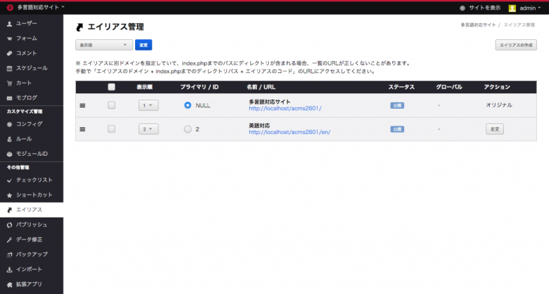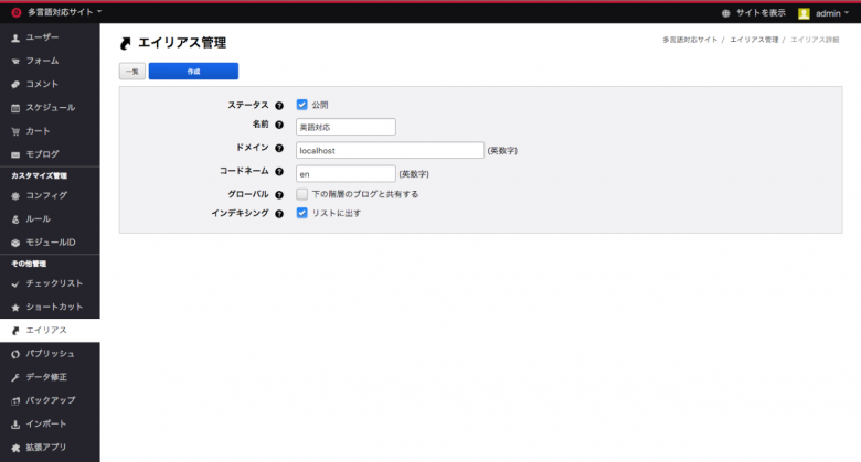 まずは、日本語と英語のサイトが同じ情報を表示できるようにします。 http://example.com/ と http://example.com/en/ どちらも bid : 1 が表示されるように、エイリアスの設定をおこないます。