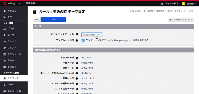英語版のテーマとして themes に en@simple2017 というディレクトリを用意し、上記の「英語対応」ルールの「コンフィグ」の「テーマ」から「en@simple2017」を指定します。