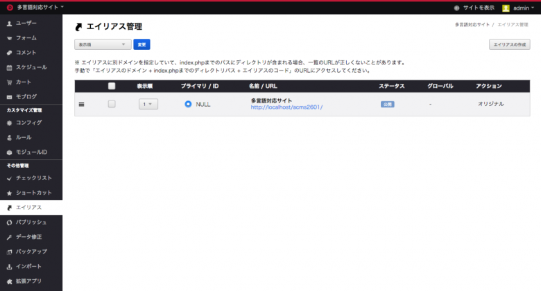 例えば、http://example.com と http://example.jp どちらも同じコンテンツを表示させたいという時に行うような設定で、CMS というよりサーバー側の設定で対応するところになります。同一ドメインで違うディレクトリについて同じコンテンツを表示させたい多言語サイトの場合には、ここで同一ドメインを設定し、ディレクトリまでをエイリアス指定します。
