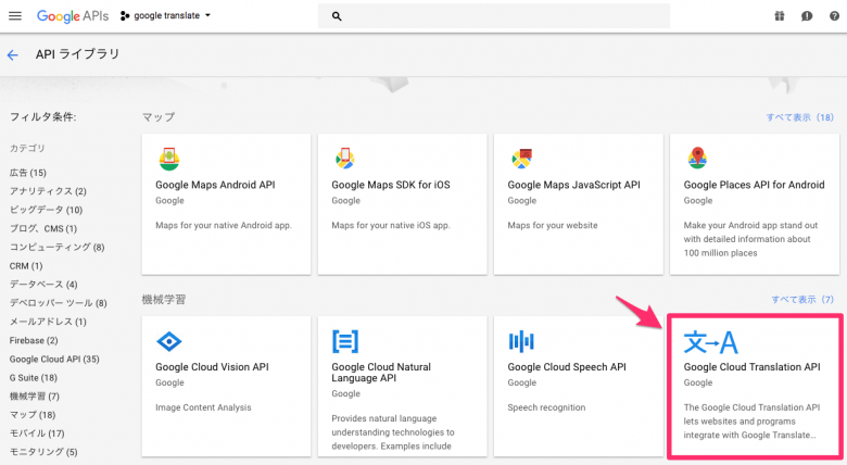 次は、サブカラムより「ライブラリ」という項目をクリックし、API ライブラリのページに移動します。そのページにて、Google Cloud Translation APIという項目を検索して有効化してください。