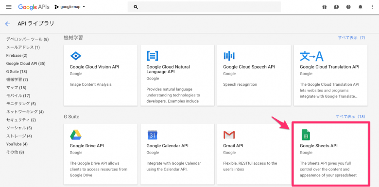 次は、サブカラムより「ライブラリ」という項目をクリックし、API ライブラリのページに移動します。そのページにて、Google Sheet APIという項目を検索して有効化してください。