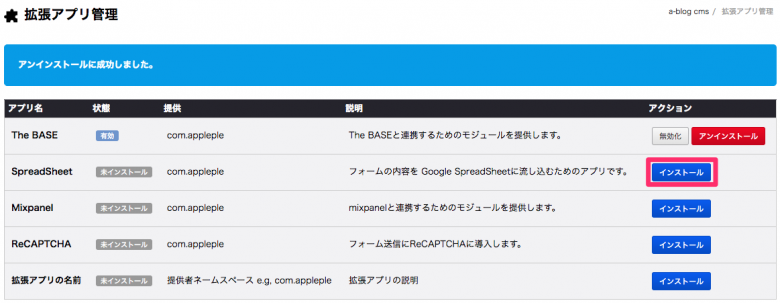 管理画面 > 拡張アプリより、 SpreadSheet をインストールします。インストール完了後は、管理画面 > SpreadSheet より Google Spread Sheet の管理画面に移動します。