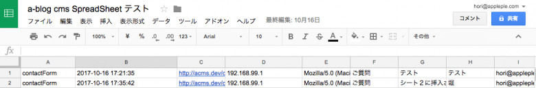 simple2017のお問い合わせフォームから送信された内容をGoogle SpreadSheetに追加登録してみましょう。下の図のような実行結果になっていれば成功です。