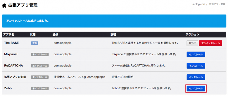 管理ページ > 拡張アプリ より「拡張アプリ管理」のページに移動します。そのページより下の図のようにZohoをインストールします。