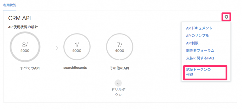 https://crm.zoho.com/crm/ShowSetup.do?tab=devSpace&subTab=api&action=developerapiにて認証トークンを作成します。下の画像の歯車アイコンをクリックすると認証トークンを作成という項目が出てきます。