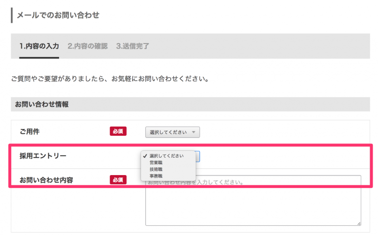 お問い合わせに採用情報のエントリーに紐付いたプルダウンを追加してみましょう。