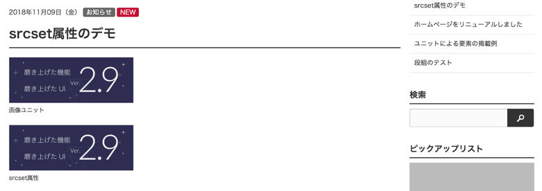 以下の画像は画像ユニット、「画像解像度の変更」を実装するためにimg要素にsrcset属性を使った例です。テーマは公式テーマのsite2018を使用しています。どちらのユニットも1/3カラム幅を使用しています。デスクトップから表示した際は1/3幅になっていますが、スクリーンサイズが479px以下になったときは1カラムに変更します。そのときに、高解像度のRetinaディスプレイで閲覧すると画像ユニットの画像のほうがすこし文字がボケて読みにくくなっているのがわかります。