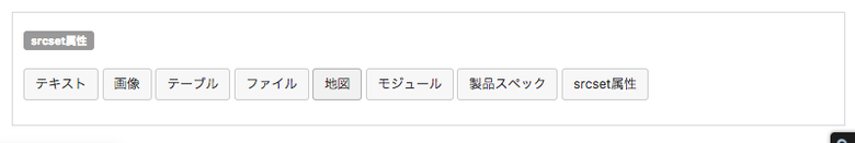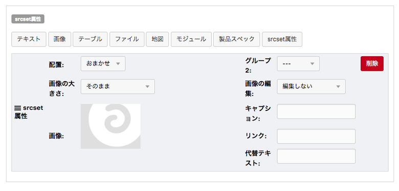 エントリー作成画面に移動すると、srcset属性というユニット追加ボタンが追加されています。1つエントリーを作成して、画像ユニットと比べてみてください。比べてみるときは、どちらのユニットも画像の幅を1/3カラム幅にして登録してください。