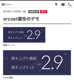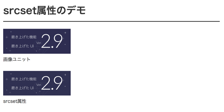 しかし、srcset属性を使ったユニットでは画像解像度の変更が行われ、ユーザーの閲覧環境に最適な画像をブラウザが判断して提供しているためRetinaディスプレイでラスタ画像を表示しても綺麗に表示されています。