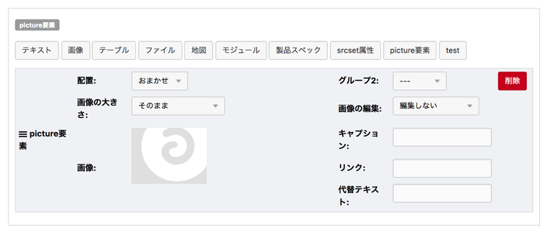 エントリー作成画面に移動すると、picture要素というユニット追加ボタンが追加されています。1つエントリーを作成して、画像ユニットとpicture要素を挿入して2つのユニットを比べてみてください。