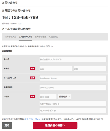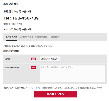 さらに「送信内容の確認へ」ボタンのvalue属性を「次のステップへ」に変更します。必須項目を入力をし、「次のステップへ」ボタンをクリックすると、step#2ブロックで表示されるはずのお客様情報のフォームへ移動するはずです。