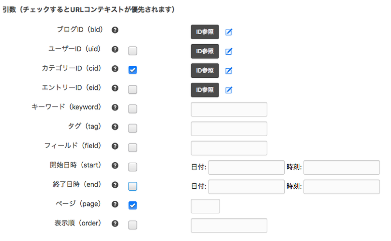 先ほどthemes/site2018/include/entry/masonry.html に記述したモジュールID news_summary を管理画面から作成しましょう。管理画面 > モジュールID よりモジュールIDを新規作成していただけます。この際に下の図のように、カテゴリーIDとページの引数にチェックをつけておきましょう。これでポストインクルード実行の際に、次のページのエントリーサマリーを読み込んで表示することができます。