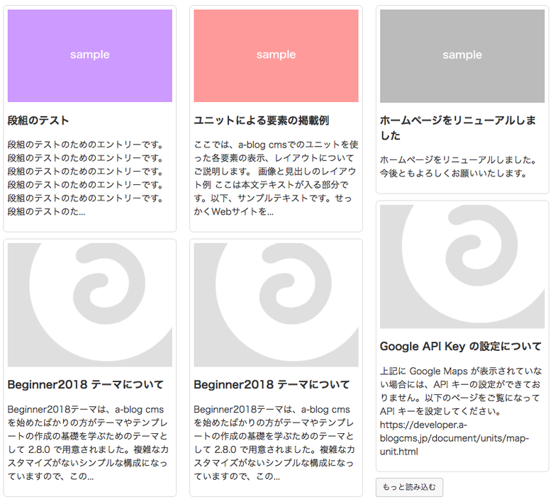 site2018テーマのお知らせページでMasonryレイアウトを利用した一覧ページを作ってみましょう。ただし「もっと読み込む」ボタンが押されたタイミングで次のページのエントリーサマリーを読み込み、そのコンテンツに再びMasonryレイアウトを適応するものとします。