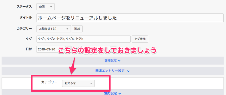 次に、/themes/site2018/admin/entry/field.html に貼り付けます。 貼り付け後、エントリーの編集画面を開くとセレクトメニューが表示さているのでカテゴリーに合わせていくつかエントリーに設定をしておきましょう。