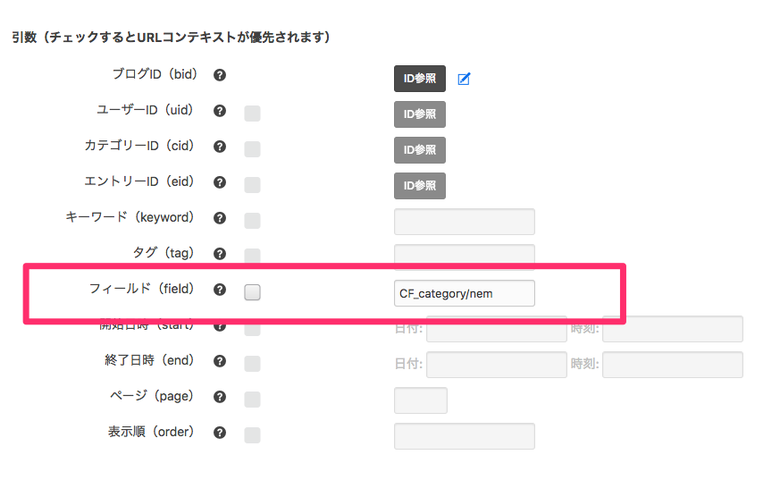 引数のフィールド(field)の部分に「CF_category/nem」を記入します。 上記のように指定することで「CF_category」というフィールドの値だけを出力することができます。 また、「/nem」という記述がないと正確にフィールドが絞り込まれませんので注意が必要です。