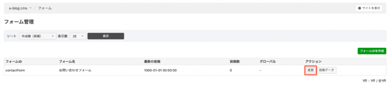 フォームの投稿データをエントリーへ変換したいフォームIDの変更画面に移動します。今回はcontactFormを使用します。