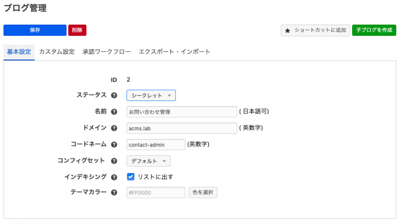 以下のように子ブログを作ります。管理者のみ閲覧できるように今回はシークレットブログで作成します。