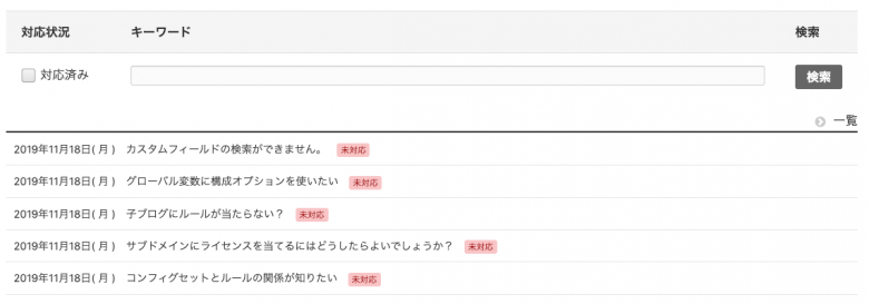 カスタマイズがうまく完了していれば、お問い合わせから送信があった場合は以下のように子ブログでエントリー一覧が表示されます。
