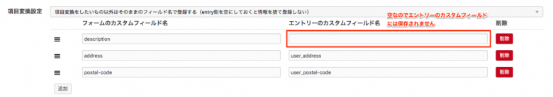 こちらの設定では、あらかじめフォームのフィールド名に対応するエントリーのカスタムフィールド名を記述しておくことによって、フォームから送信された内容が一部、別名でエントリーのカスタムフィールドに登録されます。ここに設定されていない項目についてはそのままのフィールド名でエントリーのカスタムフィールドに登録されます。なお、下の画像のようにエントリー側の項目が空の場合は、対応するフォームのフィールドがエントリーのカスタムフィールドに保存されなくなります。