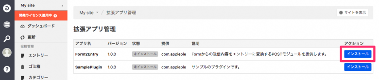 設置したら、管理画面 > 拡張アプリよりForm2Entryをインストールします。