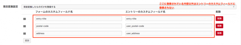 この設定では、あらかじめフォームの設定で登録された内容以外の送信内容が全て破棄されてエントリーのカスタムフィールドに登録されます。
