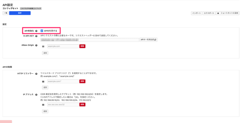 コンフィグ > 一般設定 >API設定からAPI機能についての設定を行うことができます。
