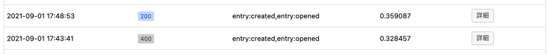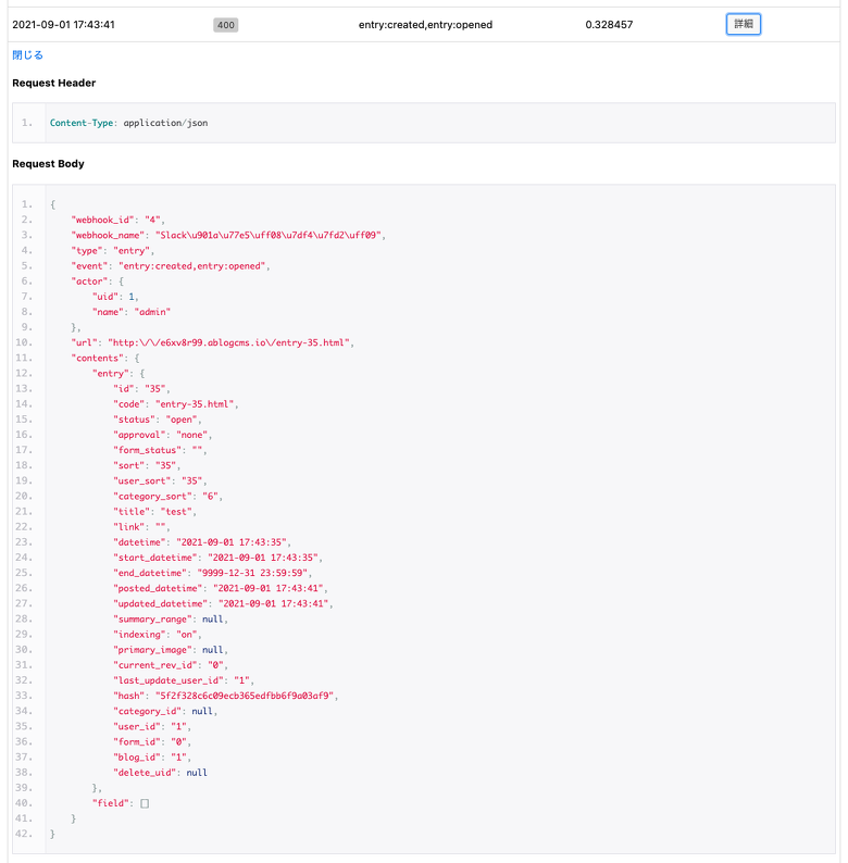 来ていない場合は、a-blog cms の管理画面>Wehook>ログを表示し、ステータスコードが400になっていないか(400だとエラー、200だと成功)確認します。