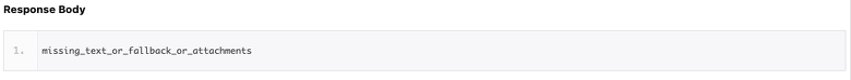 もし400になっていて、ログ>Response Bodyの項目で missing_text_or_fallback_or_attachmentsと表示されていたら、ペイロードの書き方が悪いかもしれません。見直してみてください。