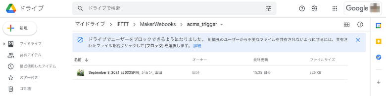 }設定ができたら、フォトコンテストフォームを送信して、Google Driveに写真が入ってきているか確認します。 今回はDrive folder path を「IFTTT/MakerWebooks/{{EventName}}」に指定したので、もしなかった場合は新しくディレクトリが作られています。