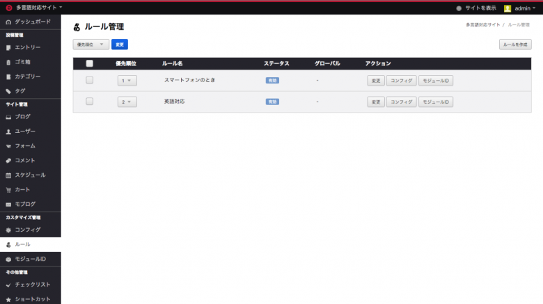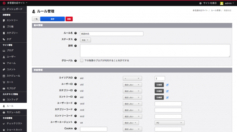 管理画面の「ルール」で先ほど作った「英語対応」エイリアスに対応する「英語対応」ルールを新規作成します。