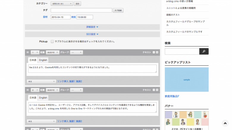 a-blog cms のコンテンツについては、「ユニット」と「カスタムフィールド」と2つの方法で登録が可能です。