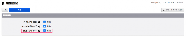 関連エントリー機能を使用可能にするために、[管理画面 > コンフィグ > 編集設定] より「関連エントリー」のチェックボックスにチェックを入れます。
