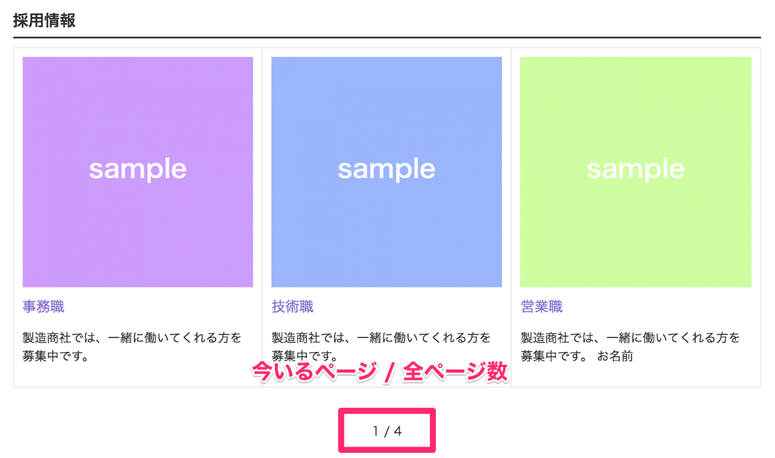 表示させる 1 / 4 は「現在表示しているページ / 全ページ数」ということになります。