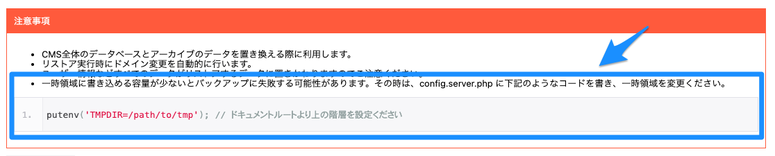 特定の共有サーバーを使用時に、一時領域に書き込める容量が少ないとバックアップに失敗する可能性があります。それを解決する方法を管理画面に追記しました。同じ問題が起こった場合は下記の方法をお試しください。