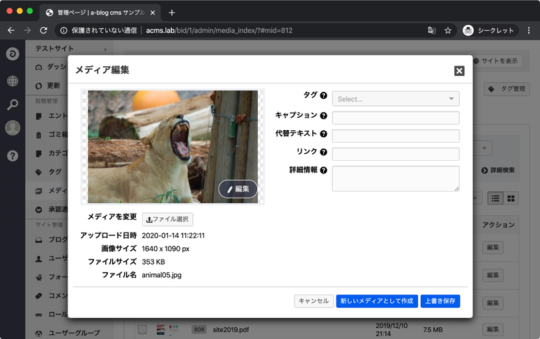 以前からもファイルデータをメディアとして登録した際にはパーマリンクが生成される機能が用意されていましたが、Ver. 2.11.5よりパーマリンクがランダム文字列で表示されるようになりました。