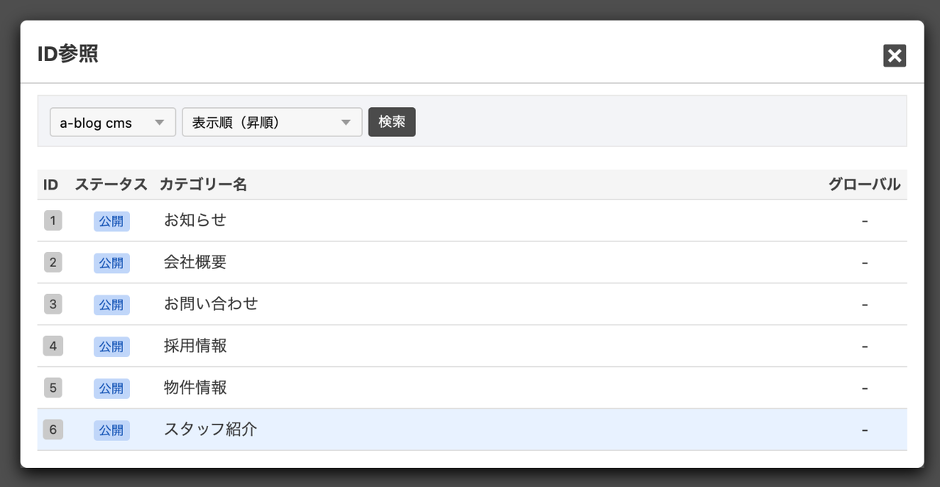 さらに今回は「物件情報」のコンテンツを追加するため、カテゴリーID(cid)の「ID参照」ボタンをクリッックし、引数としてカテゴリーID欄で「物件情報」を選択します。