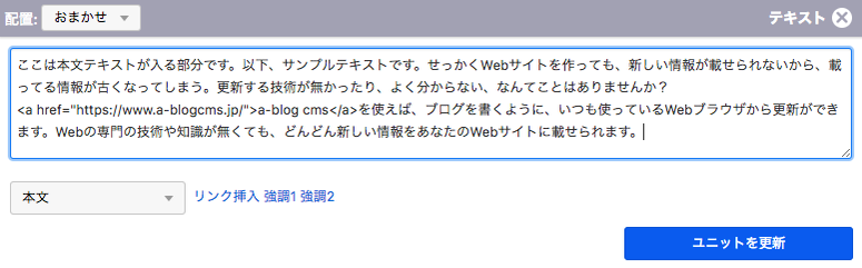 テキストユニットの標準に導入されるエディターが「Lite Editor」になりました。下のように以前は「リンク挿入」などをクリックすると直接HTMLが挿入されていましたが、新しいエディターでは実際にどのように表示されるか視覚的にわかりやすくなりました。