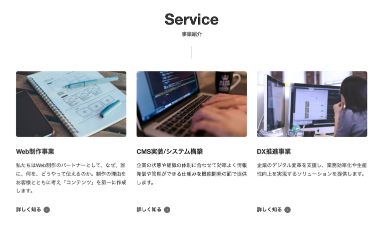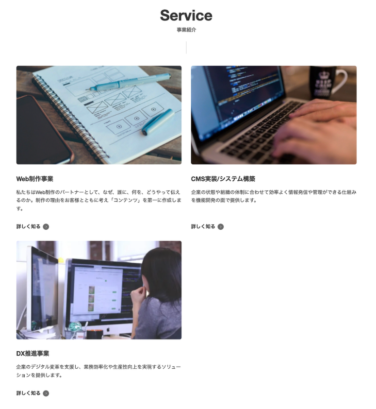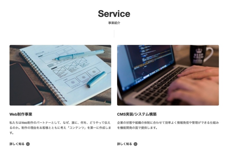 当初、打ち合わせ時には「事業紹介」については増えないと聞いており、コンテンツとしては 2つなので、col-6 と Class を設定し、横に2枚並ぶようにテンプレートに書かれていました。