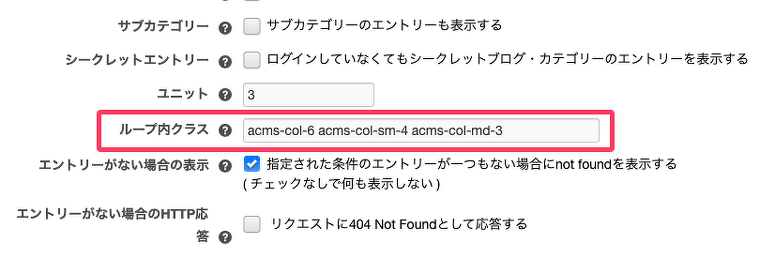 カスタム設定で設定した SELECT( col-base , col-sm , col-md )を元に、表示設定の「ループ内クラス」{entry:loop.class} を自動で書くことができる JavaScript を用意しました。こうすることでテンプレートは標準的な記述のままで済ますことができ、独自に設定したい時にも対応が可能となります。