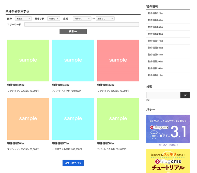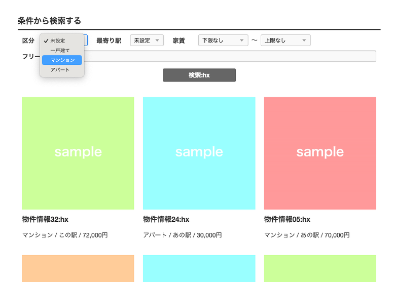 物件情報カテゴリーでは、hx-post を利用してフォームから送信されたデータを URL 形式に変換し、その結果を表示する仕組みを採用しています。また、標準のページャー機能を htmx を使った Ajax 読み込み形式にカスタマイズし、よりスムーズなページ遷移を実現しています。