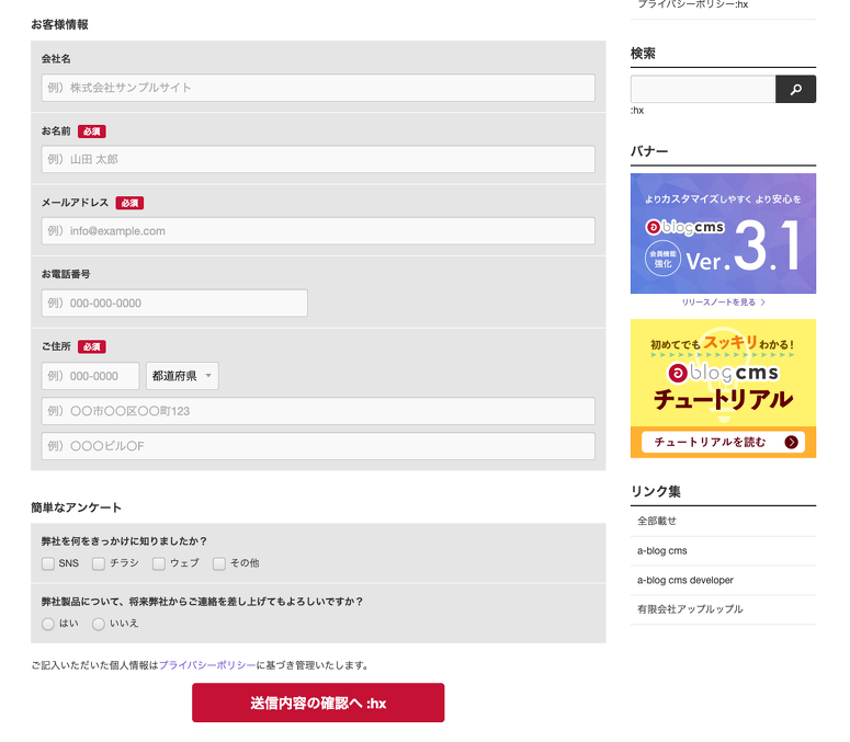 a-blog cms の標準フォーム機能を利用して、確認画面や送信完了画面への遷移も Ajax を介して行われます。現在は確認画面に遷移した際にページ上部に自動スクロールしないため、ユーザーが何が起こったかを理解しにくいという課題があります。これを解消し、より良いユーザー体験を提供するために、次期アップデートで改善を図る予定です。