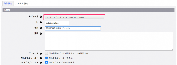 モジュールIDを作成する場合にはモジュールから下の図のようにオートコンプリート(Admin_Entry_Autocomplete)を選択します。また引数を指定することでエントリーを絞り込む範囲を制限することができます。例えばカテゴリーの引数に1を指定するとカテゴリーが1のエントリーの中から記事を検索し登録することができます。