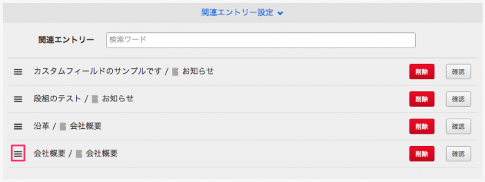 登録されたエントリーは下記のピンクの線で囲まれたハンドルを掴んでドラッグアンドドロップすることで表示順を変更することも可能です。また、右の確認ボタンを押すことで、実際にそのエントリーのページに移動して内容を確認することもできます。