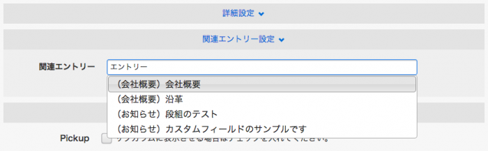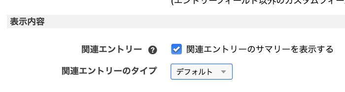 その際、関連エントリー一覧を表示できるように表示設定の一番下の表示内容で下の図のようにチェックをつけ関連エントリーのタイプを選択します。