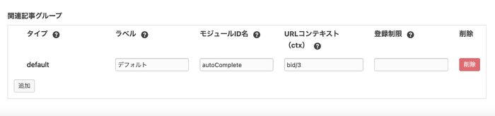 関連エントリー機能を使用可能にするために、 管理画面 > コンフィグ > 編集設定 の一番下の設定より下の図のように 関連記事グループの設定を行います。