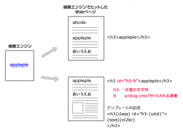 a-blog cmsでは、エントリー内の見出しに固有のidを自動で振ることができます。そうすることにより、ユーザーが検索エンジンからWebページに移動してきた際、検索ワードにマッチしているページ内の該当箇所にすぐジャンプすることができます。(この機能はv1.2.0より使用できます。)